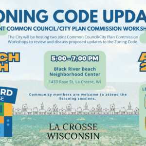 Zoning Code Update – Joint Common Council/City Plan Commission Workshop | March 18, 2026 The City will be hosting two Joint Common Council/City Plan Commission Workshops to review and discuss proposed updates to the Zoning Code. 18 Mar 5:00 pm - 7:00 pm Black River Beach Neighborhood Center 1433 Rose Street, La Crosse, WI.